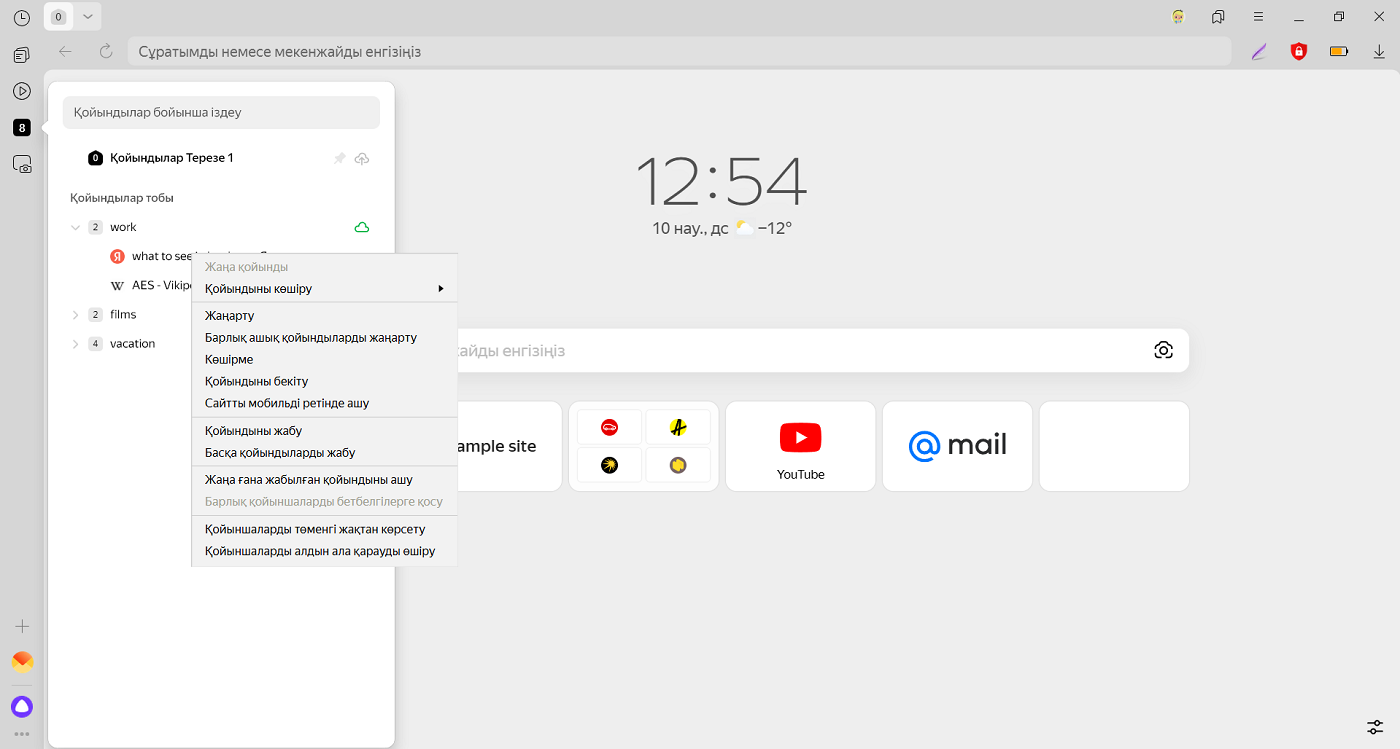 • Қойындыны жаңа топқа тасымалдау — қойындыға тінтуірдің оң жақ батырмасымен басыңыз және Қойындыны тасымалдау → Жаңа топ тармағын таңдаңыз.