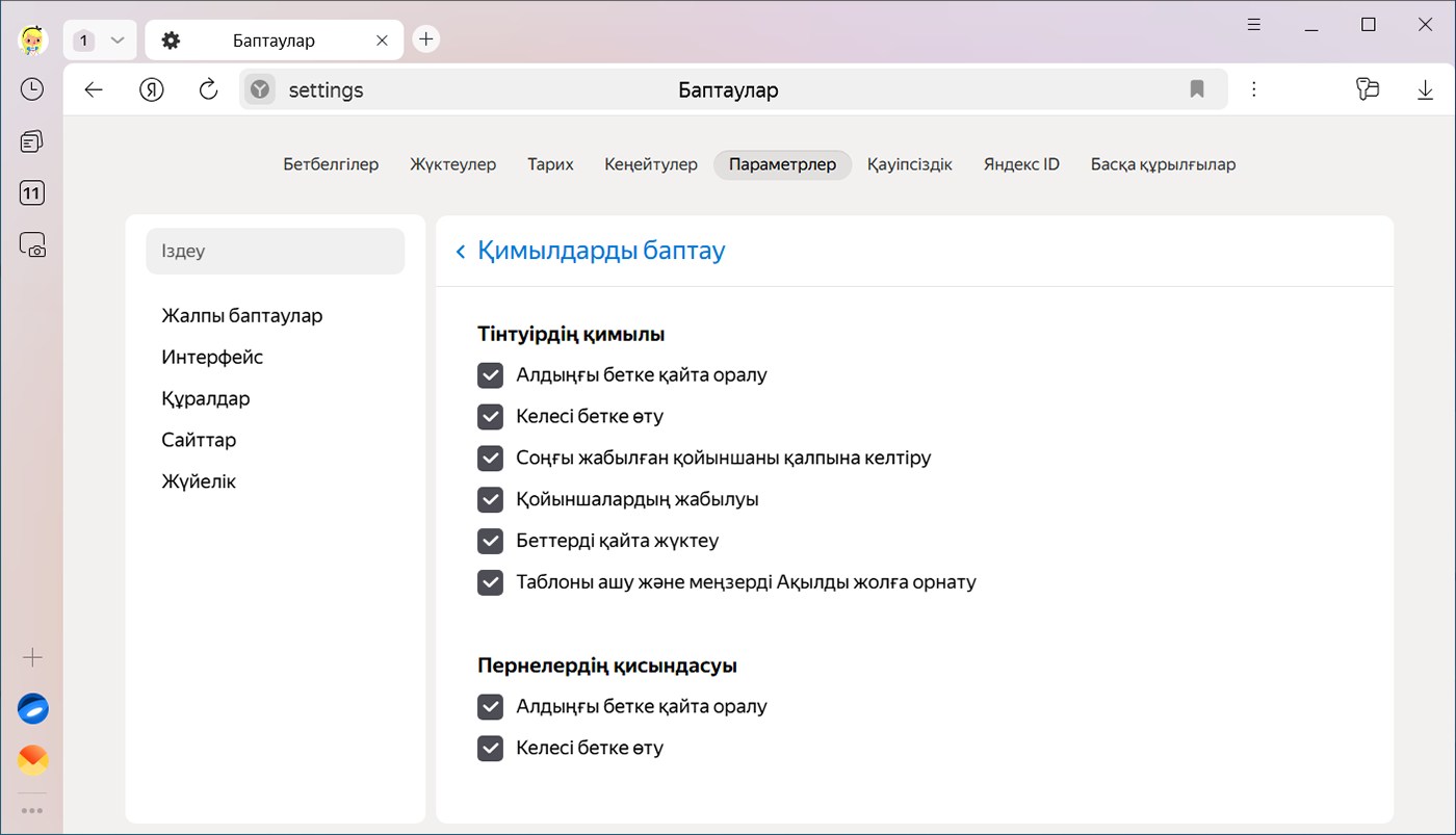 Әдепкісінше Яндекс Браузер баптауларында тінтуір ымдарына қолдау көрсету өшірілген. Тінтуір ымдарын пайдалану үшін: