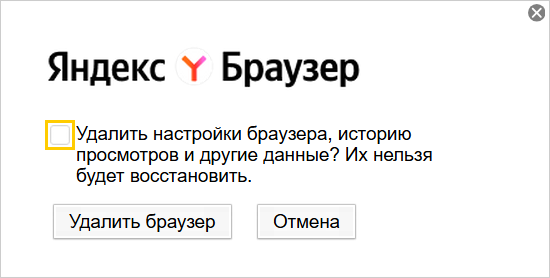 7. Нажмите Удалить браузер, оставив неактивной опцию Удалить настройки браузера, историю просмотров и другие данные.