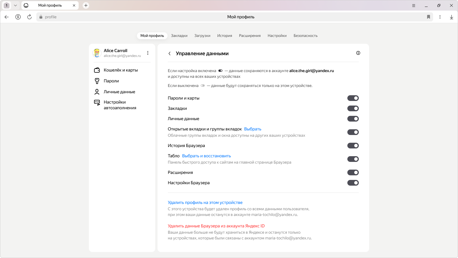 Данные по умолчанию автоматически сохраняются в вашем аккаунте, который привязан к Яндекс ID, и доступны на всех ваших устройствах (компьютере, смартфоне, планшете), на которых установлен Яндекс Браузер.