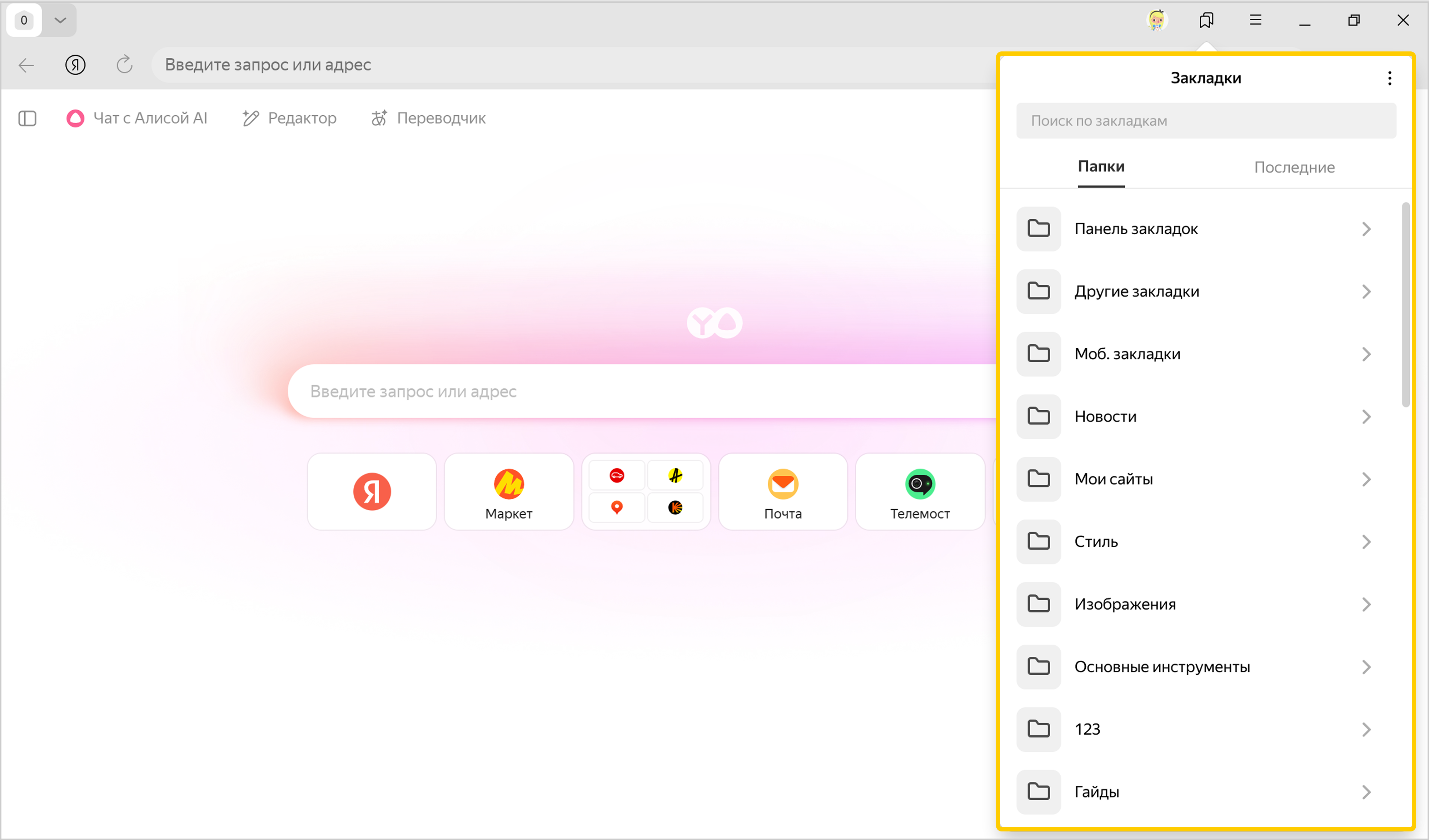 Во вкладке Папки — выберите папку, где находится нужная закладка.