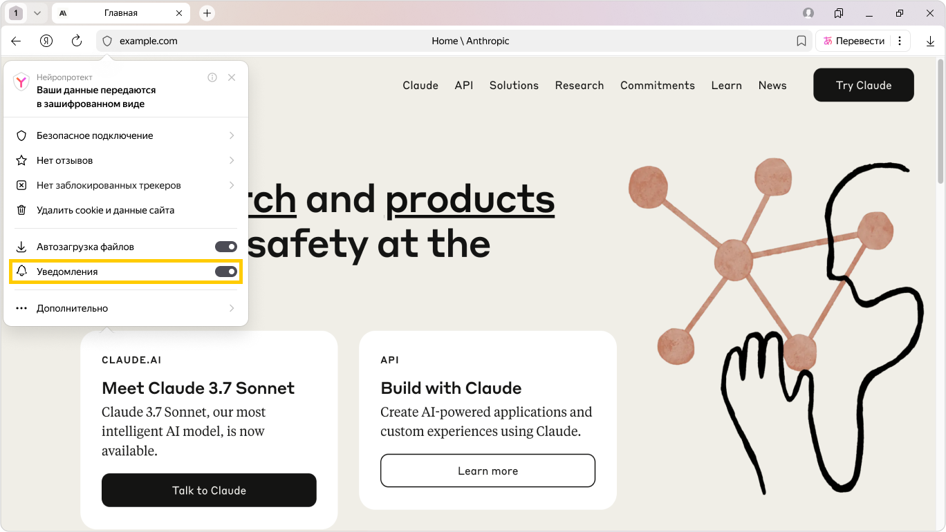 Cайты могут отправлять уведомления о новостях, комментариях, обновлениях и других событиях. Как правило, сайты запрашивают разрешение на отправку уведомлений, но иногда могут делать это без спроса. В Браузере вы можете разрешать или блокировать уведомления от конкретного сайта или вовсе запретить всем сайтам предлагать отправку уведомлений.