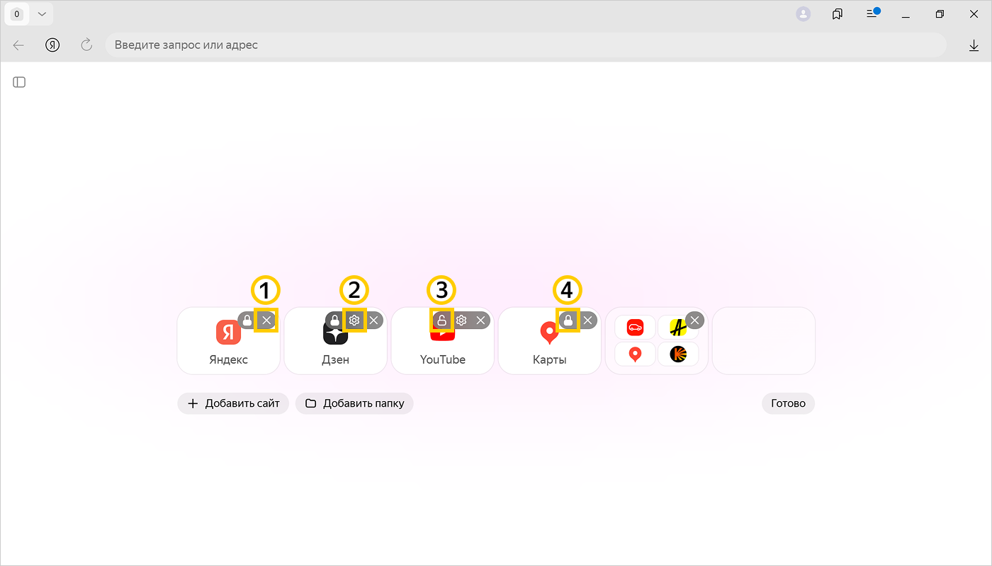 Периодически Браузер обновляет плитки на Табло, добавляет сайты, которые вы чаще других ищете через Умную строку или открываете через Табло. Чтобы не потерять нужные вам плитки, закрепите их.