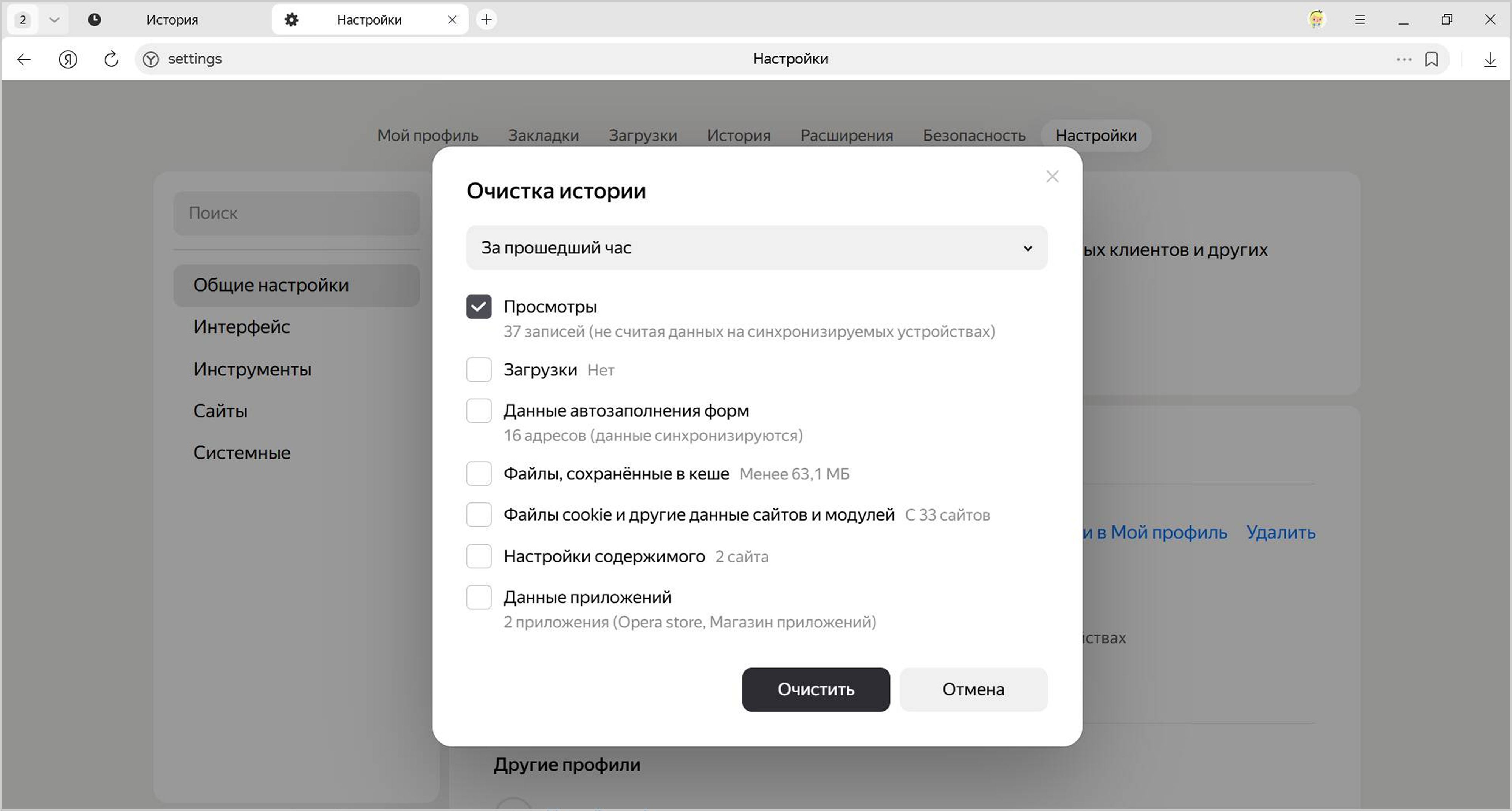В окне Очистка истории укажите период времени, за который нужно удалить историю.