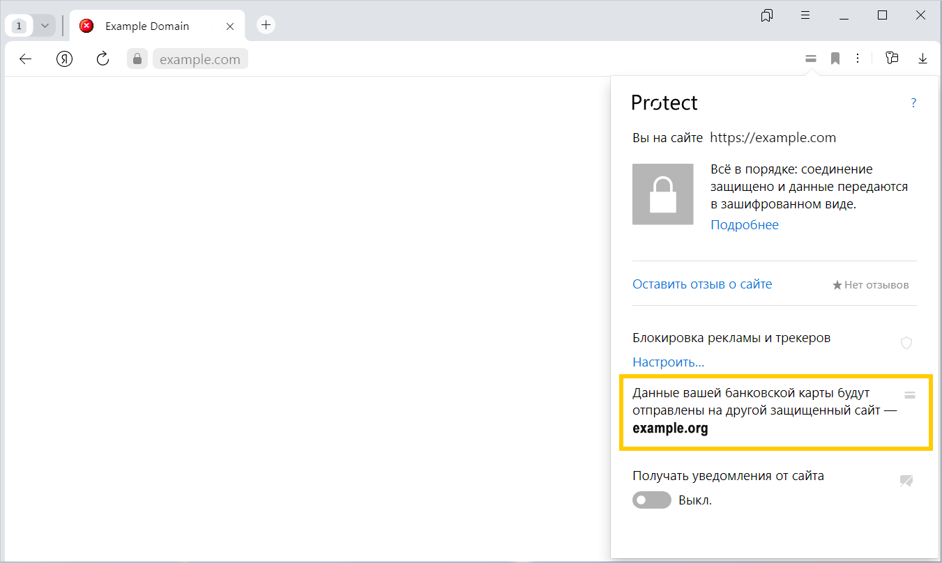 Соединение с этим сайтом не шифруется, но данные вашей карты будут отправлены на защищённый example.com. |