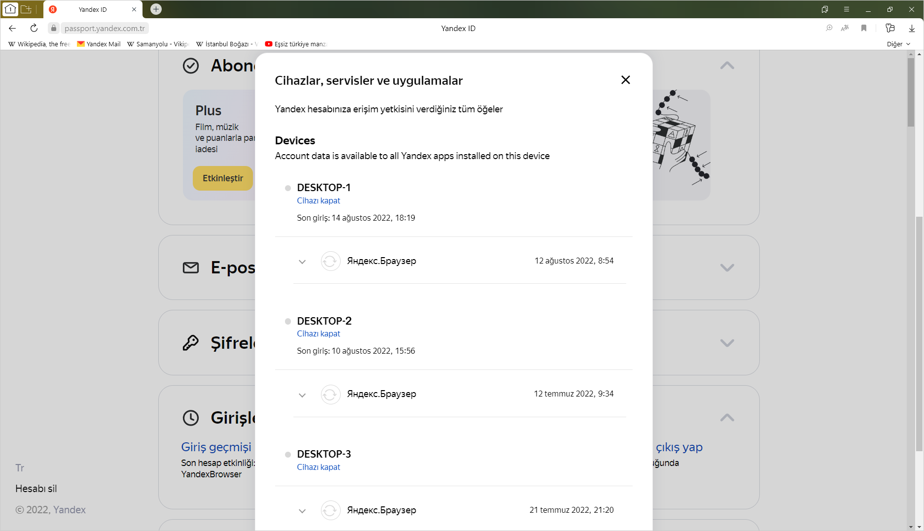5. Son giriş alanındaki tarih ve saati kontrol edin. Erişilemeyen cihazda yer alan Yandex Browser'daki verilerin silinme işlemi eşitlendikten sonra, bu alandaki değerler güncellenir. Eşitleme, internet hızına ve veri miktarına bağlı olarak 40 dakikaya kadar sürebilir.