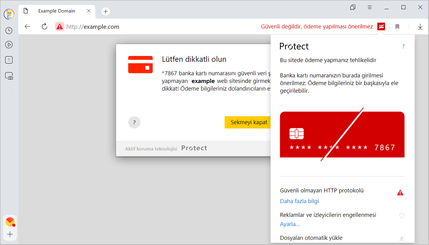 Bir sitede kart numarası girildiğinde Yandex Browser iki tür uyarı mesajı gösterebilir: