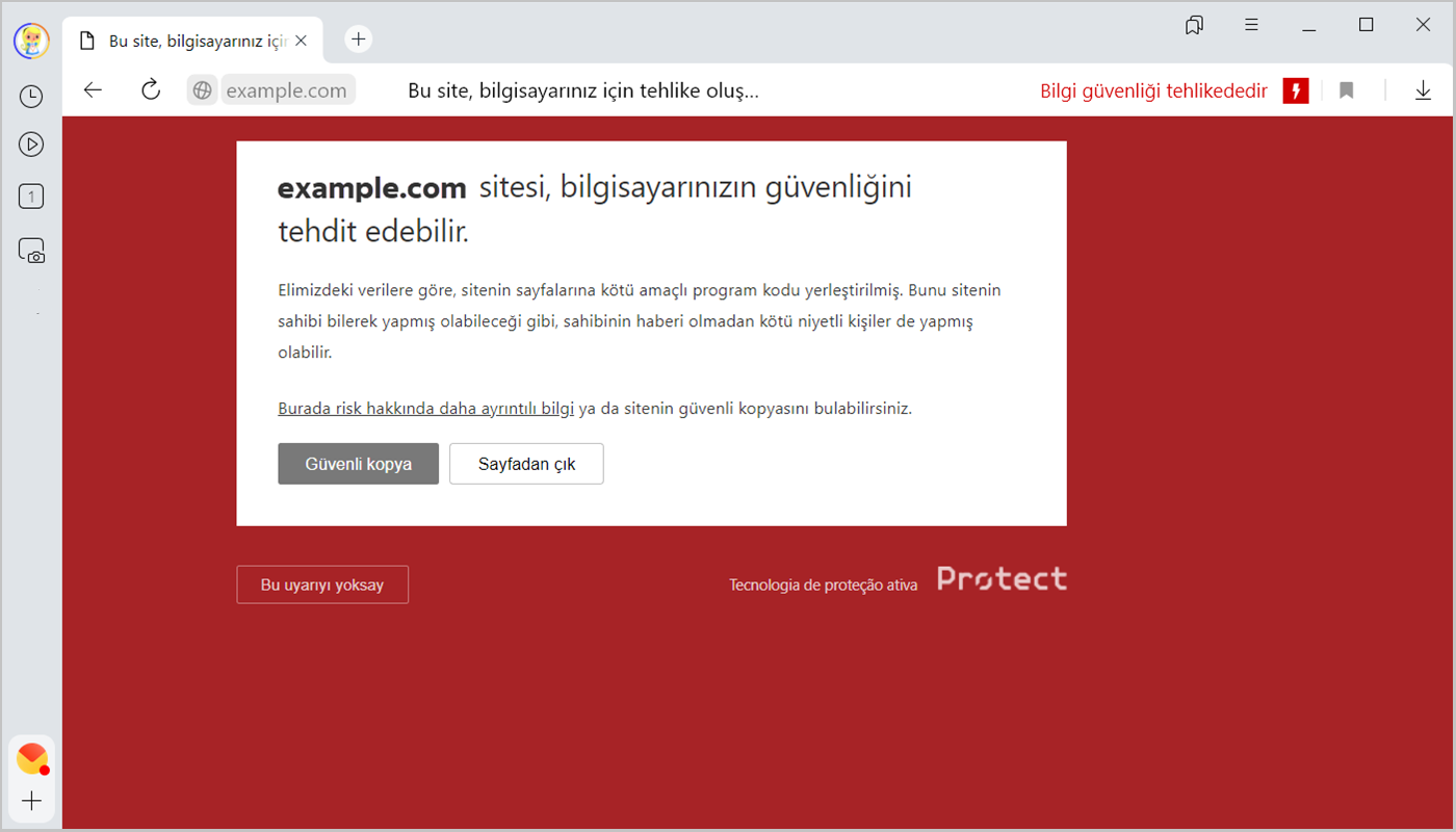 Tehlikeli içerik bulunan siteyi ziyaret etmeniz kesinlikle önerilmez. Kötü amaçlı kodlar bilgisayarınıza virüs bulaştırabilir veya başkalarının kişisel bilgileriniz ile çevrimiçi ödeme verilerinize erişmesine yol açabilir.