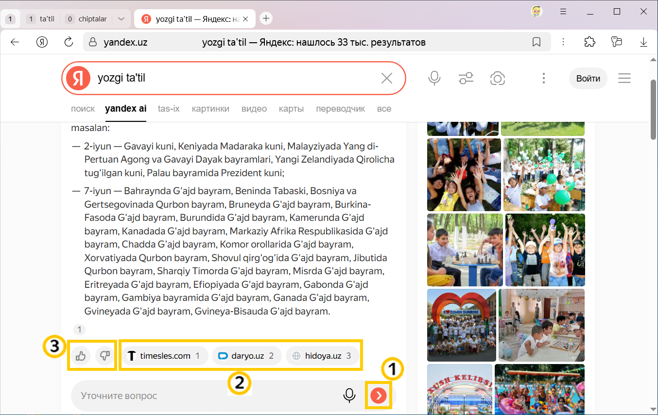 1. Soʻrovni aniqlashtirish. Koʻproq tafsilotlar kiriting yoki aniqlashtiruvchi savol bering va bosing . Neyro avvalgi soʻrovning kontekstini hisobga oladi.