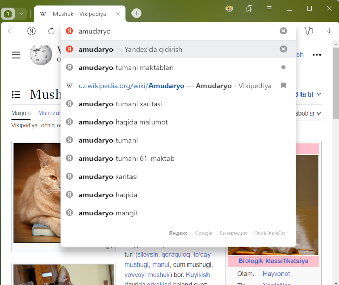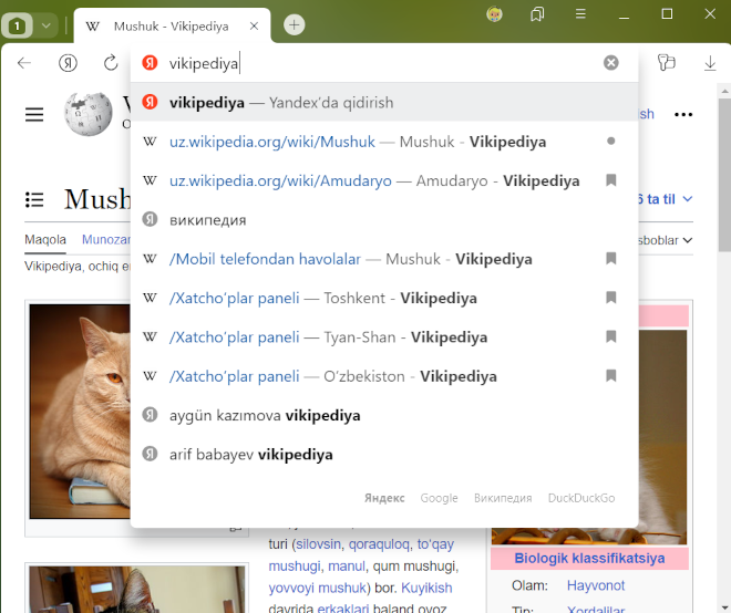 Manzil satriga qidirish soʻrovlarini kiritish mumkin — Brauzer sizga nima kerak ekanini oʻzi tushunadi.
