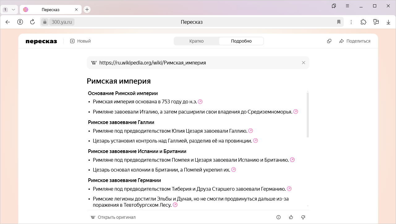 4. YandexGPT neyron tarmogʻi maqola, video yoki matnli hujjatni tahlil qilishni boshlaydi. Oynada asosiy tezislar paydo boʻladi.