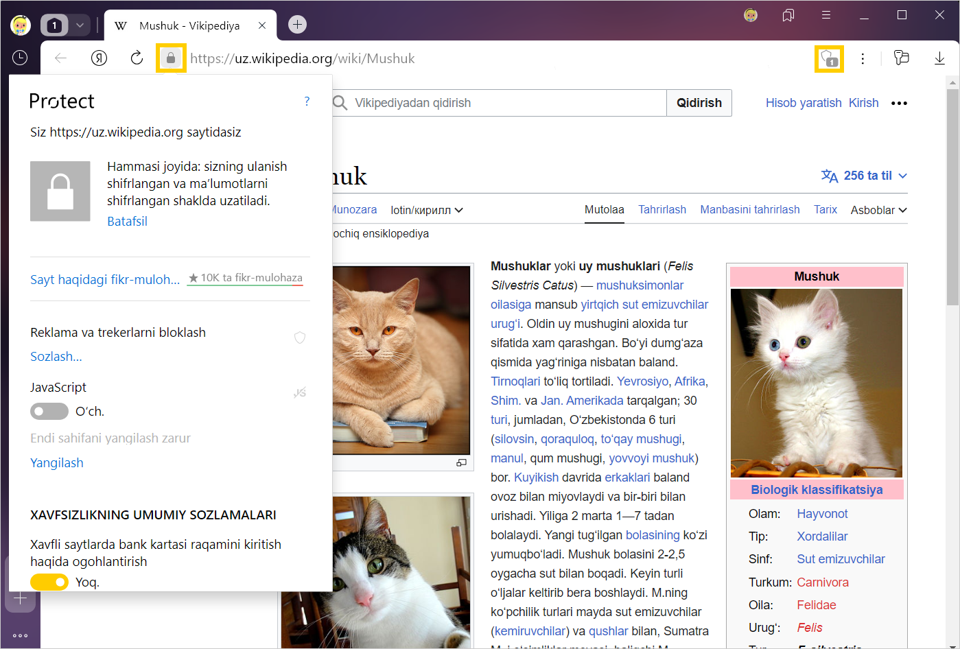 Xavfsizlik belgilari sahifa manzilining o‘ng va chap tomonida ko‘rsatiladi. Protect panelini ochish uchun belgini bosing. U yerda xavfsizlik tafsilotlarini ko‘rasiz va u bilan bog‘langan sozlamalarni o‘zgartirishingiz mumkin.