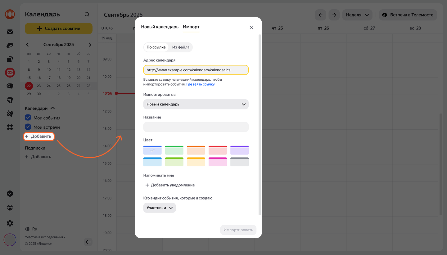 Вы можете перенести в Яндекс Календарь события из календаря на другом сервисе. Это можно сделать с помощью ссылки на другой календарь или файла календаря в формате *.ics (iCal).