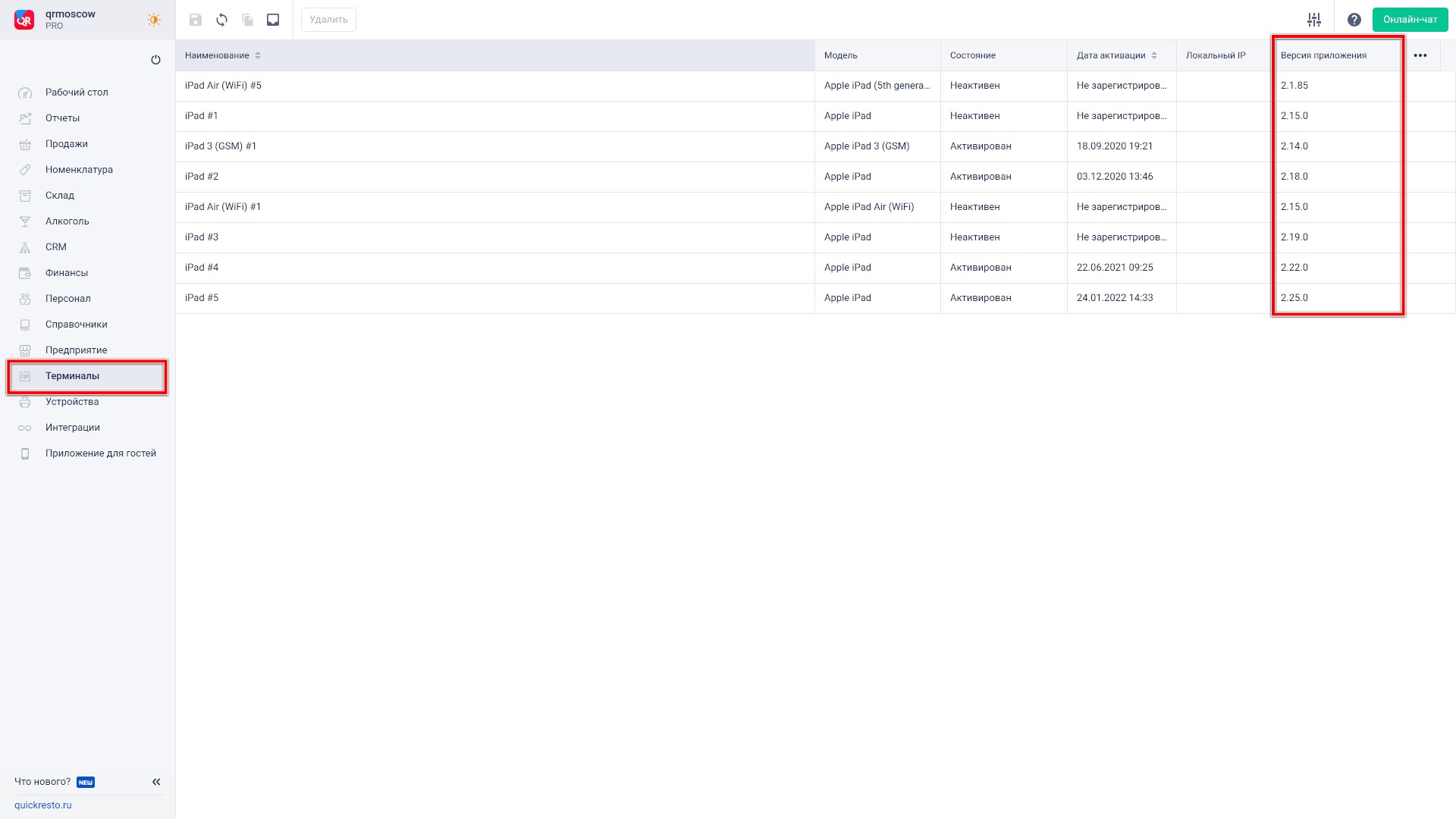 Для работы с кассовым терминалом на iPad, версия кассового приложения должна быть 2.27 или выше. Посмотреть актуальную версию активированного кассового терминала можно в разделе бэк-офиса Терминалы: