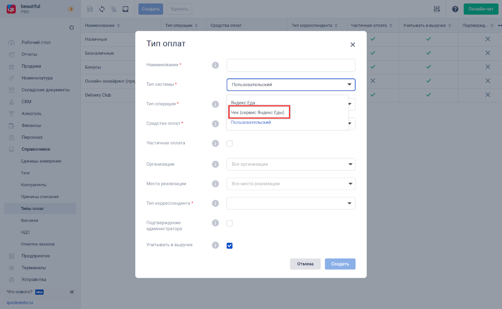 Перейдите в раздел Справочники — Типы оплат и добавьте новый тип оплаты, выбрав в качестве поля Тип системы: Чек (сервис Яндекс Еды):