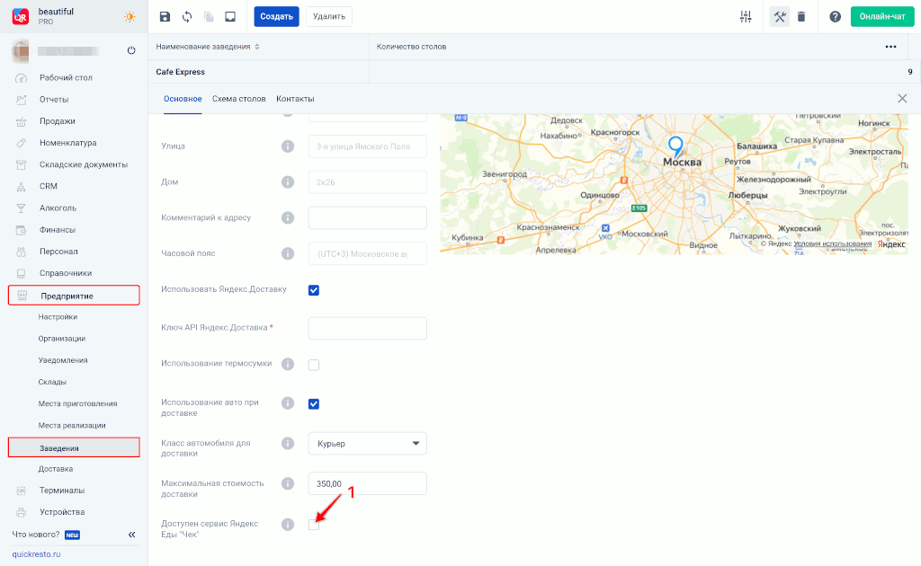- На вкладке Основное поставьте галочку Доступен сервис Яндекс Еды «Чек», чтобы открыть дополнительные настройки.