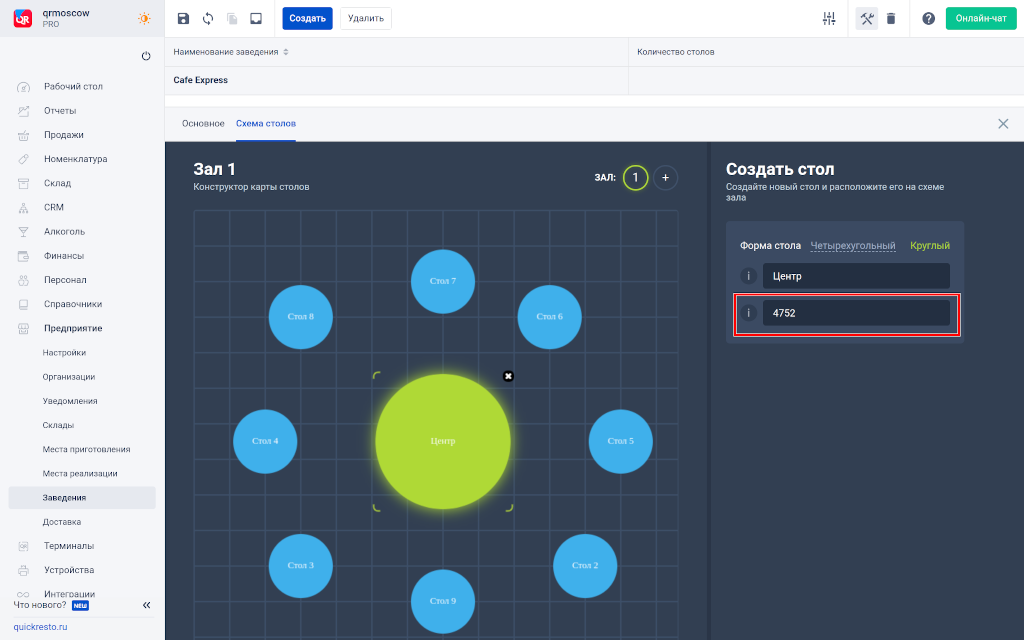 Перейдите в раздел Предприятие — Заведения. Выберите заведение, для которого необходимо настроить привязку QR-кодов к столикам. Перейдите на вкладку Схема столов. Для каждого стола на схеме заполните поле Идентификатор стола, внеся в него значение идентификатора стола, который вы найдете в сопровождающих материалах от Яндекс Еды: