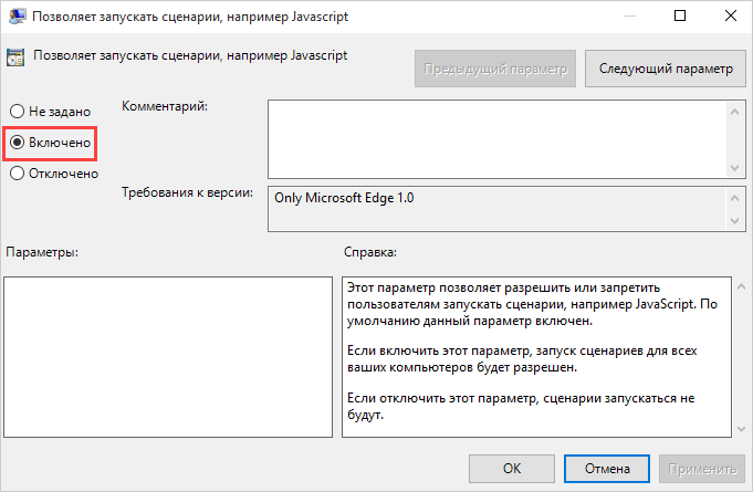 - В открывшемся меню выберите опцию Включено и нажмите ОK.