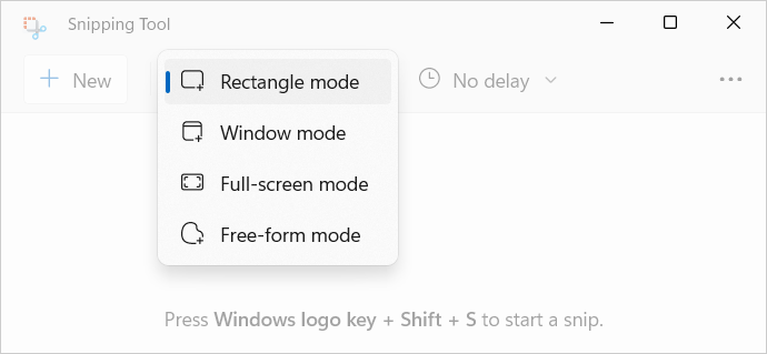 Choose a mode: rectangular or free-form snip. Press New and take a screenshot of a window or the entire screen.