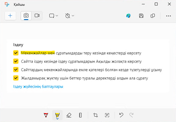 Суретті өңдеу терезесінде Қауырсынмен қолтаңба жасауға немесе Маркермен мәтінді бөлектеуге болады.