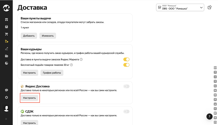 В блоке Яндекс Доставка нажмите Настроить.