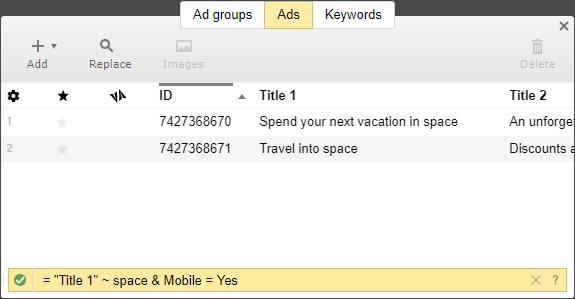 shows all ads containing the word flight in the Text column.