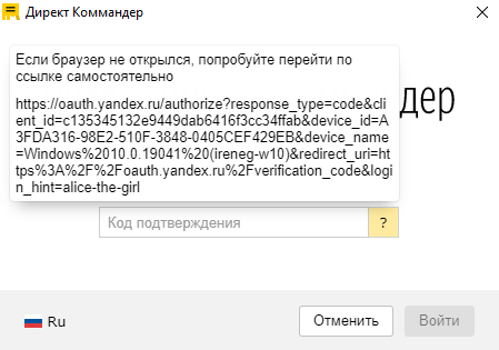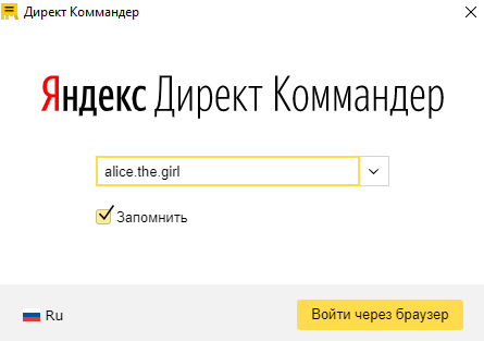 On the first launch, Direct Commander will ask your Yandex Direct username.