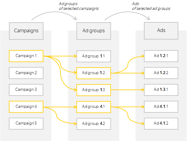 • From ads, keywords, retargeting lists, and mobile app interests to their host campaigns or ad groups.