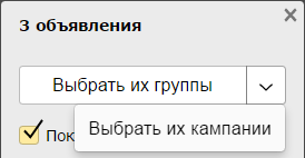 В результате будет открыта вкладка Кампании, где будут выбраны те кампании, к которым относятся выбранные объявления.