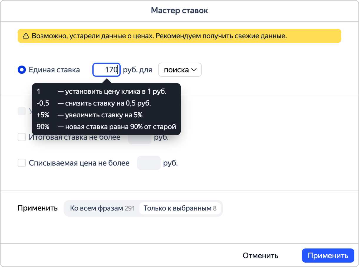 В Директ Коммандере можно быстро назначить ставки для большого количества фраз, даже если они относятся к разным кампаниям или группам объявлений. Назначить ставки можно только для кампаний с показами на поиске. В кампаниях с показами в РСЯ или на поиске и РСЯ назначить ставки невозможно.
