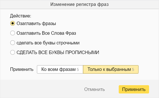 С помощью Директ Коммандера вы можете быстро изменить регистр одной или нескольких ключевых фраз. Изменение регистра не влияет на работу операторов и не приводит к обнулению статистики по фразе.