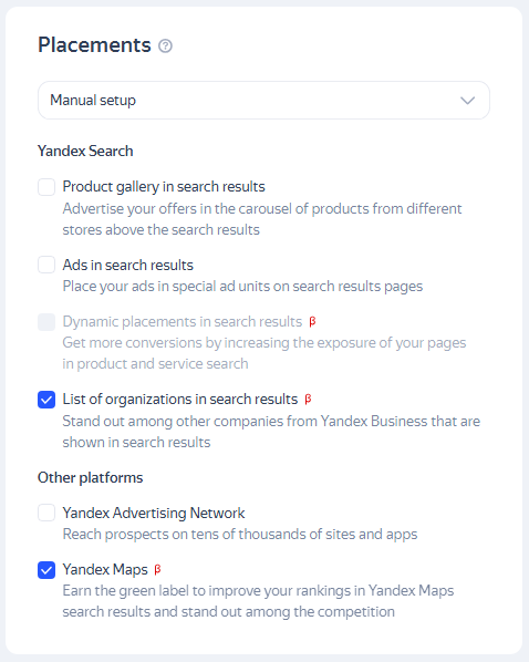 Under Placements, leave the default value Yandex Search, Yandex Advertising Network, and Yandex Maps or select Manual setup → Yandex Maps and/or List of organizations in search results.