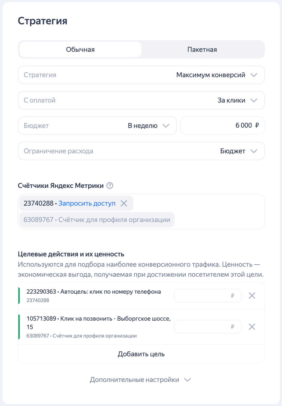 If you choose Yandex Maps as the only placement and select the "Maximum conversions" pay-per-click strategy with a cost revenue ratio limit, we recommend also setting up a tag goal for your organization profile among your optimization goals.