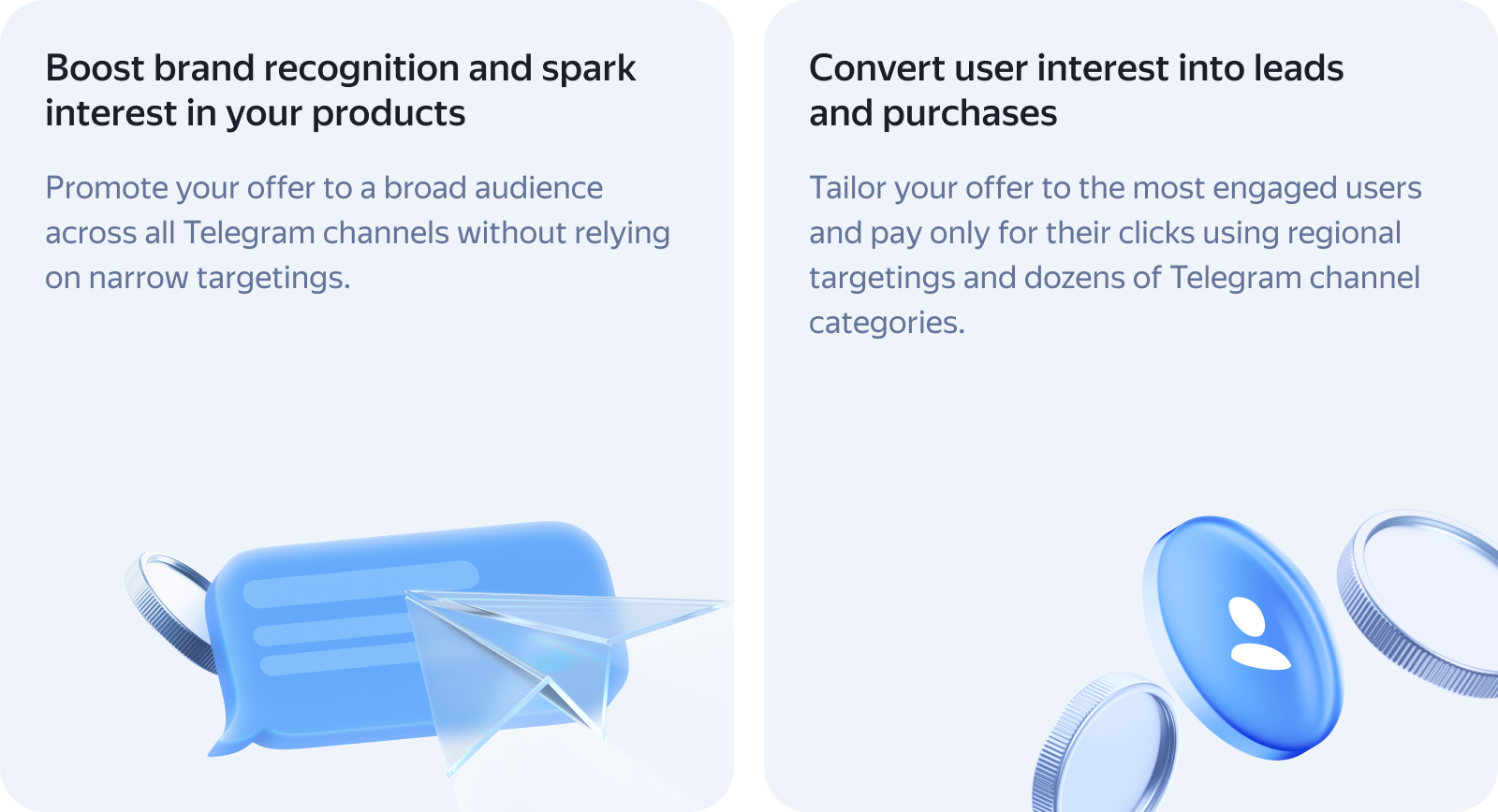 Telegram channelsβ are a new way to place your ads. Relevant ads are served in public and private Telegram channels of the Yandex Advertising Network partners.