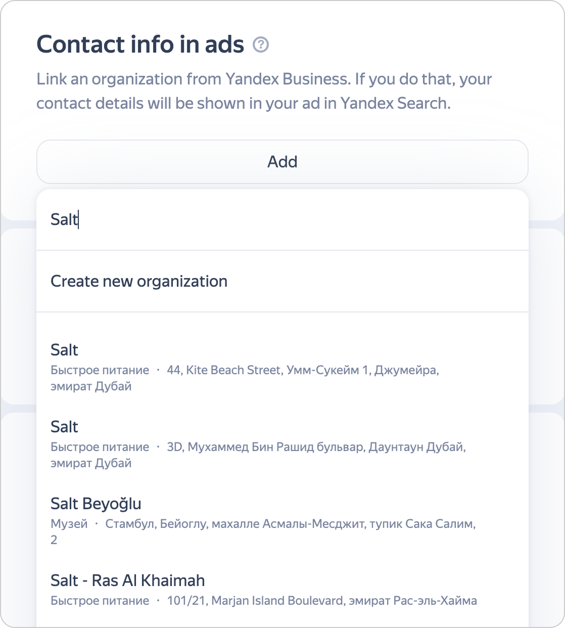 If your company isn't in Yandex Business, you can quickly add it and link it to your ad or campaign right away. To do this, click Create new organization and fill out the form.