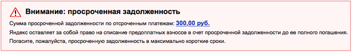 • There are overdue amounts under the deferred payment option. You can see the data about your overdue amounts on the campaigns page in the Yandex Direct interface.