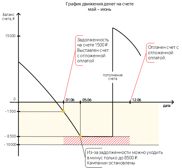 On June 12, Ivan pays the invoice with a deferred payment option using his bank card. Campaigns will run again until the account balance reaches –10,000 rubles. The friends continue to place their ads and top up their account as they like.