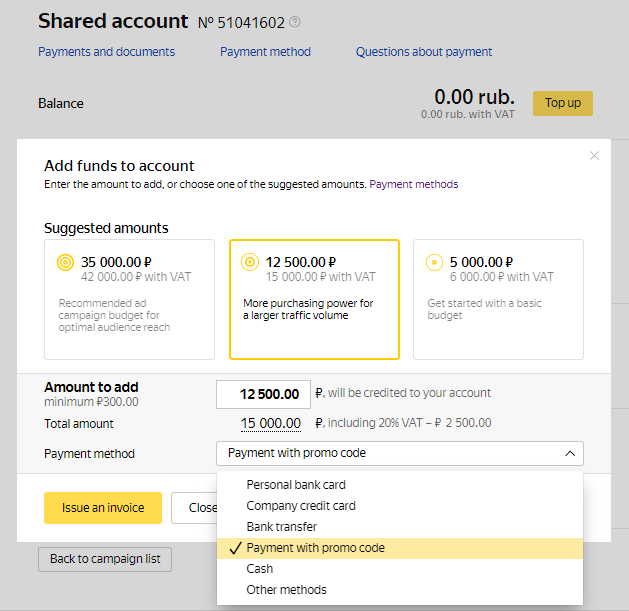 On the Add funds to account page, enter the amount of the ad campaign budget. The amount (excluding VAT) must be at least the amount specified in the promo terms.