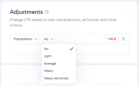 To serve the banner in rainy weather, set the Precipitation parameter to “No” and specify the adjustment of −100%.