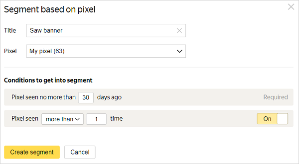 Create a segment based on a pixel in Yandex Audience. Specify the period to use for the data, and how many times the user must see the ad during the selected period.