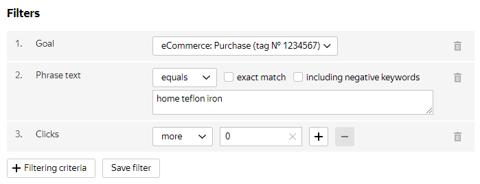 If the ROI or the cost of conversion for a keyword is below the optimal value, check the keyword using the Search queries report. In the search queries report, make the same settings as for analyzing the overall effectiveness of the campaign in Report Wizard. Add goal and keywords filters.
