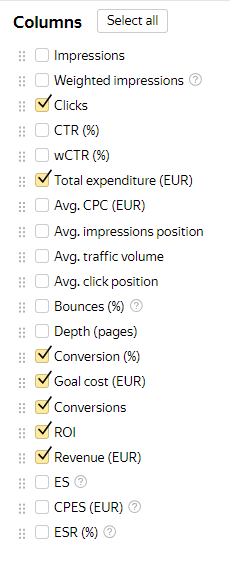 If you know the approximate value of each conversion but don't pass the conversions to Yandex Direct, you can estimate the revenue, profit, and ROI independently using data on the number of conversions and their cost in the report.