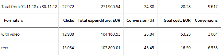 For example, by adding the Formats cross section, you may see that ads with videos bring more conversions and the price of such conversions is lower. In this case, you can get additional conversions by setting bid adjustments for serving ads with videos.