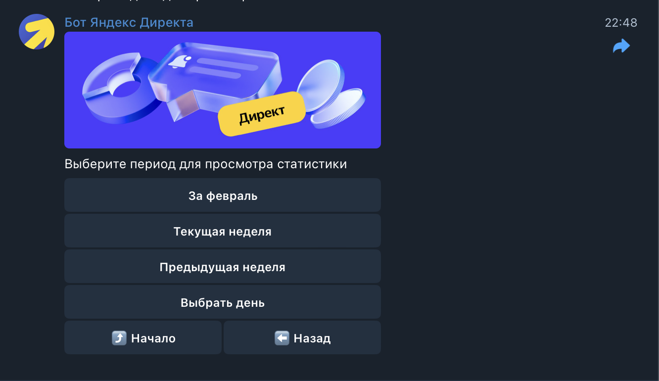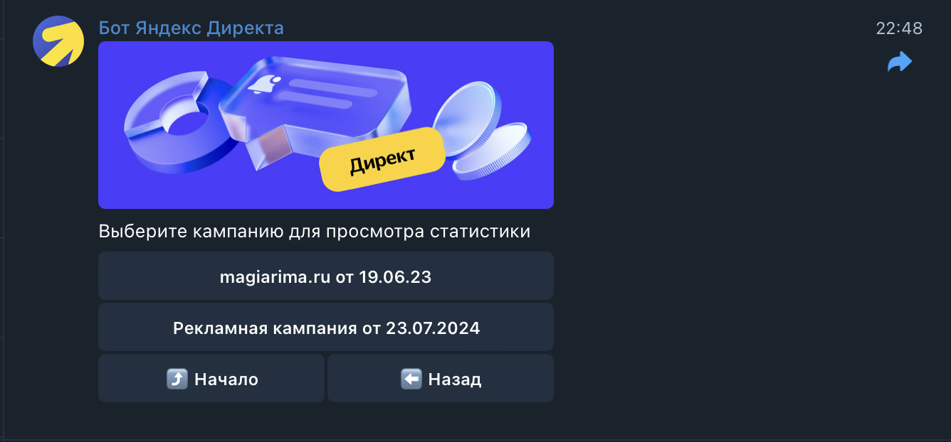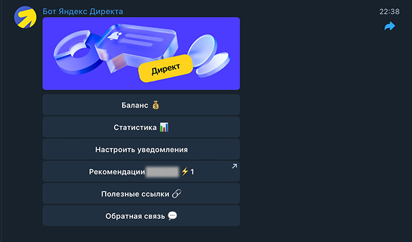 Only the chief representative of the Yandex Direct account and only in the account registered in the Russian domain zone direct.yandex.ru can add the bot and manage notifications.