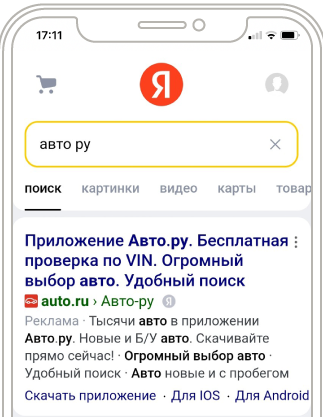 The system selects ads for display in the mobile search results based on several indicators: quality coefficient, bids (adjusted for smartphones), and CTR on mobile search.
