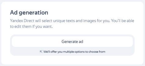 Generate an ad using AI. Based on the advertised page, Yandex Direct will create up to six ad versions using various generative algorithms and models, such as YandexGPT (title and text generation) and YandexArt (image generation).