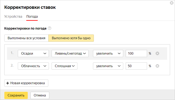 Вы можете настроить корректировки ставок в зависимости от погодных условий: температуры воздуха, интенсивности осадков и облачности.