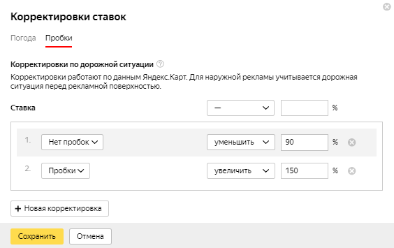 Для наружной рекламы вы можете настроить корректировки ставок в зависимости от интенсивности трафика перед рекламной поверхностью. Например, с помощью корректировок по дорожной ситуации можно показывать креативы с текстовыми сообщениями, когда у водителя есть время их прочитать.