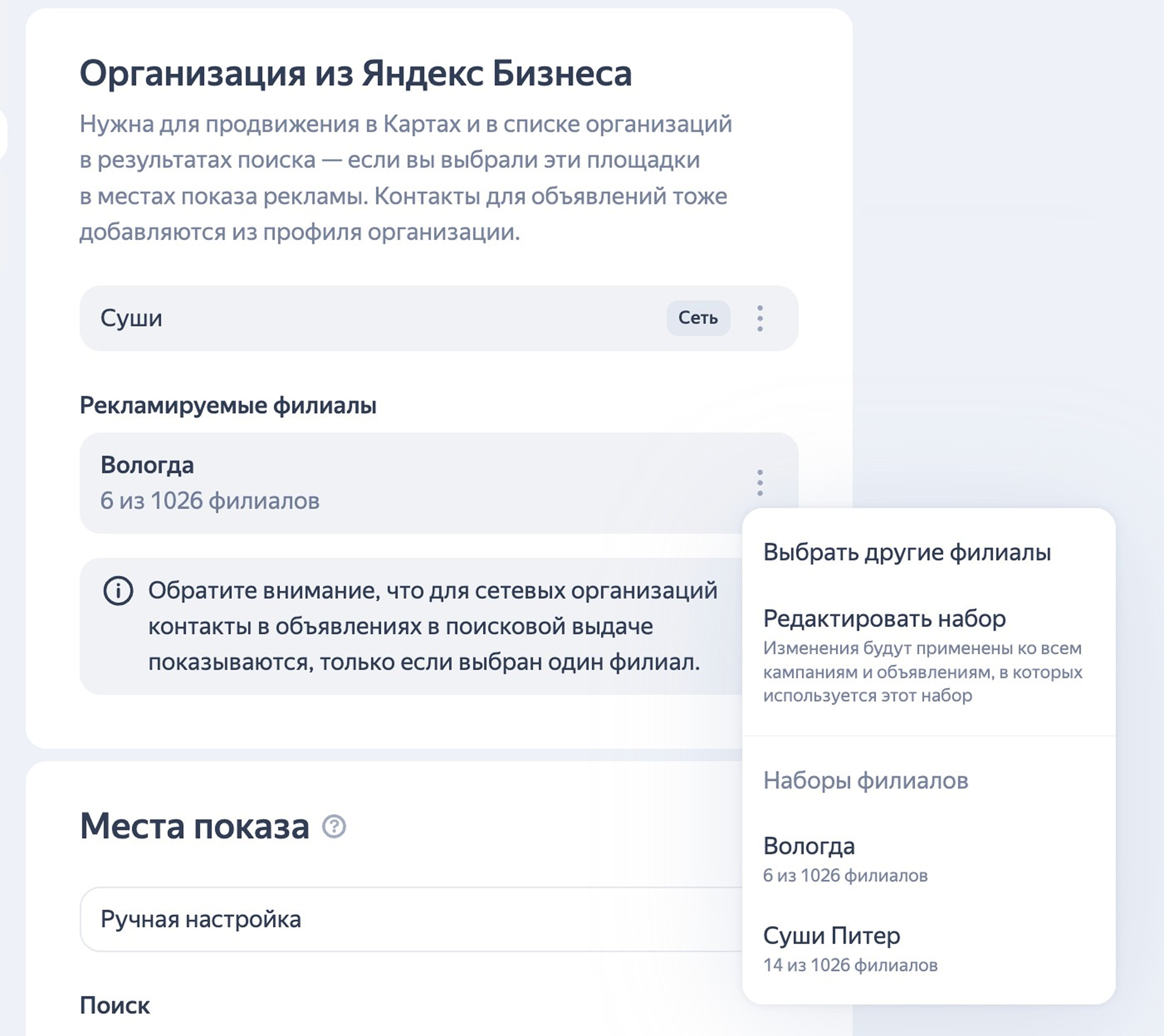 Если организация включает несколько филиалов, объединенных в сеть, к карточке организации привяжется вся сеть. Продвигайте ее целиком или настройте список филиалов.