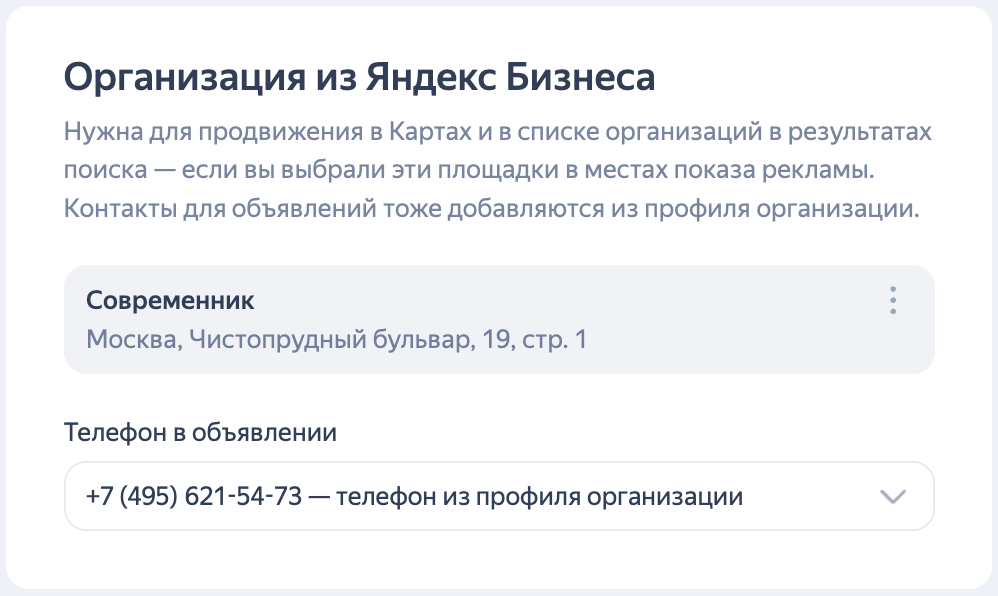 В блоке Контакты выберите номер телефона организации или добавьте вручную. Этот номер будет отображаться в карточке организации в показах.